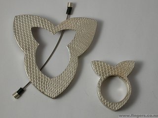 4 Pin. Oxidised stg silver, pebble, coral, bone. $450