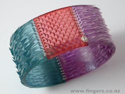Kath Inglis is a material-based maker who transforms seemingly ordinary Polyvinyl Chloride (PVC) sheet plastic into vividly coloured and intricately detailed wearable objects. Eschewing expensive gemstones and metals in favour of prosaic PCV, Inglis uses a variety of hand driven techniques to transform sleek clear PVC into highly textured surfaces that glitter with a play of light and reflection. In her highly innovative practice, Inglis manipulates flexible PVC sheet through the simple processes of hand dyeing, cutting, carving and adding layers/components through heat fusing to elevate a mundane material into the precious.