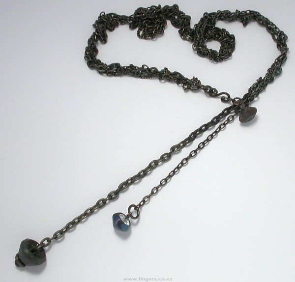 Found costume jewellery, copper, sterling silver, patination, paints, resin and Kumihimo braided necklace made by Katie Corner